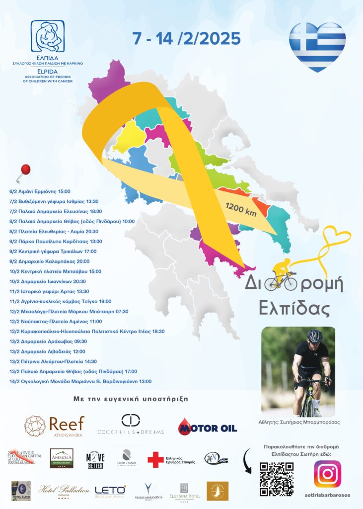 Με αφορμή την Παγκόσμια Ημέρα για τον καρκίνο της παιδικής και εφηβικής ηλικίας που είναι η 15η Φεβρουαρίου, ο Σωτήρης Μπαρμπαρόσος, ένας γενναίος αγγελιοφόρος της ελπίδας, ξεκινά μια διαδρομή αφιερωμένη στα παιδιά: από τις 7 έως τις 14 Φεβρουαρίου 2025 θα διανύσει 1.200 χιλιόμετρα με το ποδήλατό του, περνώντας από 20 δήμους της χώρας μας, για να συμβάλει στη διάδοση του έργου του Σωματείου «ΕΛΠΙΔΑ – Σύλλογος Φίλων Παιδιών με καρκίνο».