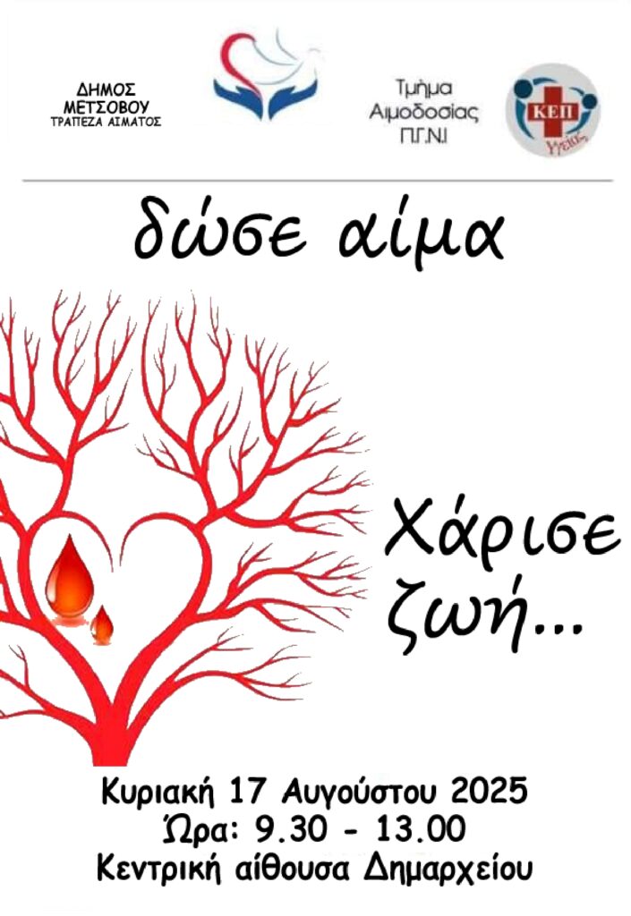 Ο Δήμος Μετσόβου, σε συνεργασία με το ΠΓΝΙ, διοργανώνει Εθελοντική Αιμοδοσία την Κυριακή 17 Αυγούστου, από τις 09:30 έως τη 13:00, στην κεντρική αίθουσα του Δημαρχείου Μετσόβου.