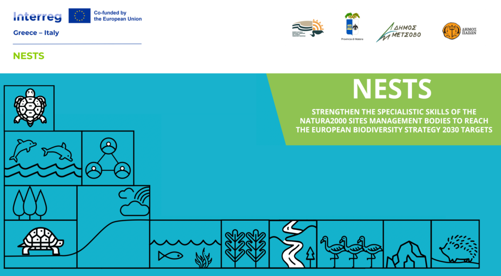 The NESTS project, in line with the EU Biodiversity Strategy 2030 and the Habitats and Birds Directives, aims to strengthen the cooperative management of Natura 2000 sites within the Greece–Italy programme area. The project has recognised the need to improve the management of these sites, by enhancing the skills of Management Bodies’ personnel and strengthen financial resources, making it easier to meet EU conservation targets. To achieve its goals, NESTS will provide training for stakeholders and decision-makers to improve the governance of Natura 2000 sites in the participating regions, promote networking, and establish a Permanent Biodiversity Observatory that will serve as a cross-border platform for continuous monitoring, assessment, and data sharing. This structure will ensure comparability of data and alignment with Natura 2000 standards, fostering a cohesive and replicable approach to biodiversity management.
