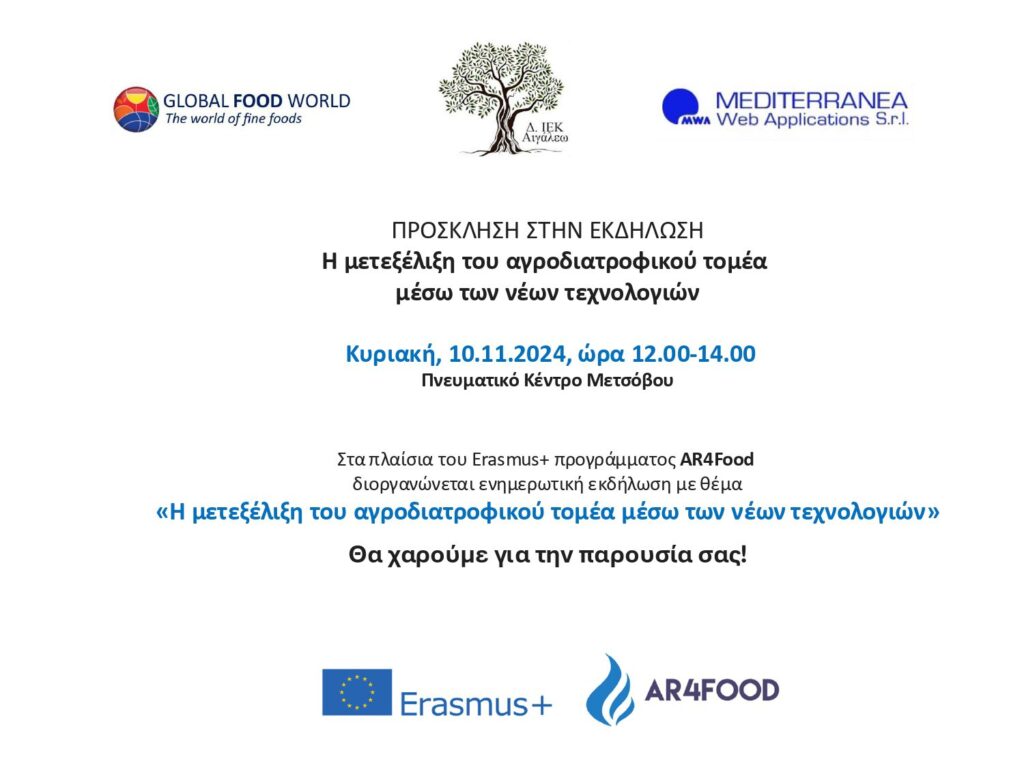 Στα πλαίσια του Erasmus+ προγράμματος AR4Food διοργανώνεται η ενημερωτική εκδήλωση με θέμα: «Η μετεξέλιξη του αγροδιατροφικού τομέα μέσω των νέων τεχνολογιών»